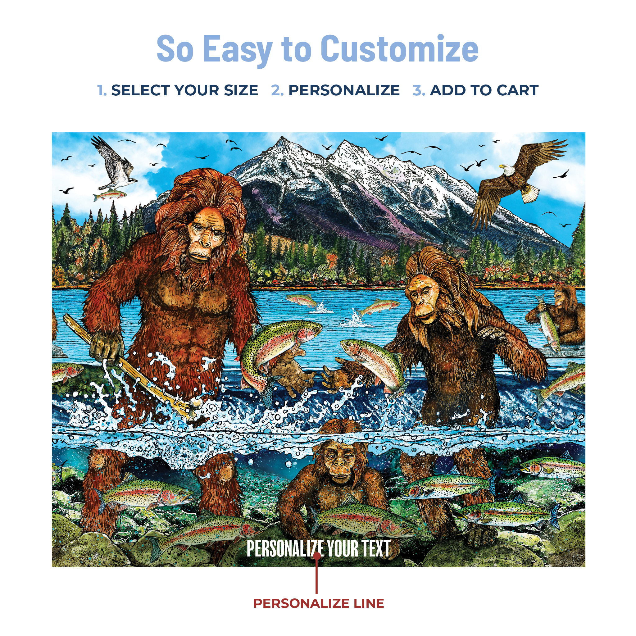 Featuring a captivating graphic of the elusive Bigfoot family, this design celebrates the legendary creature that embodies the spirit of adventure and the beauty of nature. Did you know Bigfoot is often spotted in the wilderness near water, making it a fitting emblem for every angler's journey? Personalize it with two lines of text and enjoy a unique piece that reflects your love for fishing and the lore of the wild.