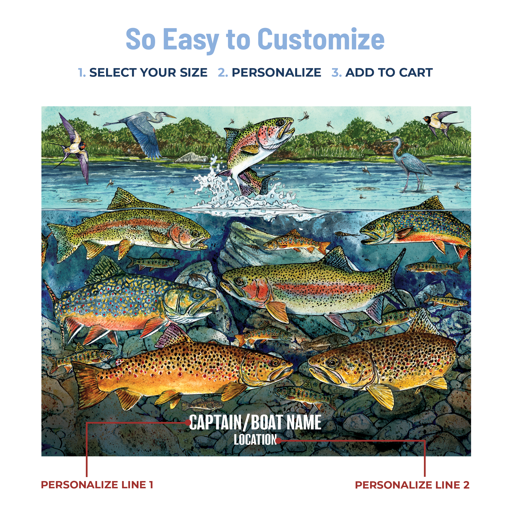 Did you know that trout are known for their incredible agility and can be found in various freshwater habitats? As you sip your favorite drink, imagine the rush of reeling in a big one, whether a rainbow or a brook trout. Personalize it with two lines of text to create a unique piece that reflects your love for trout fishing and the adventures that await on the water.