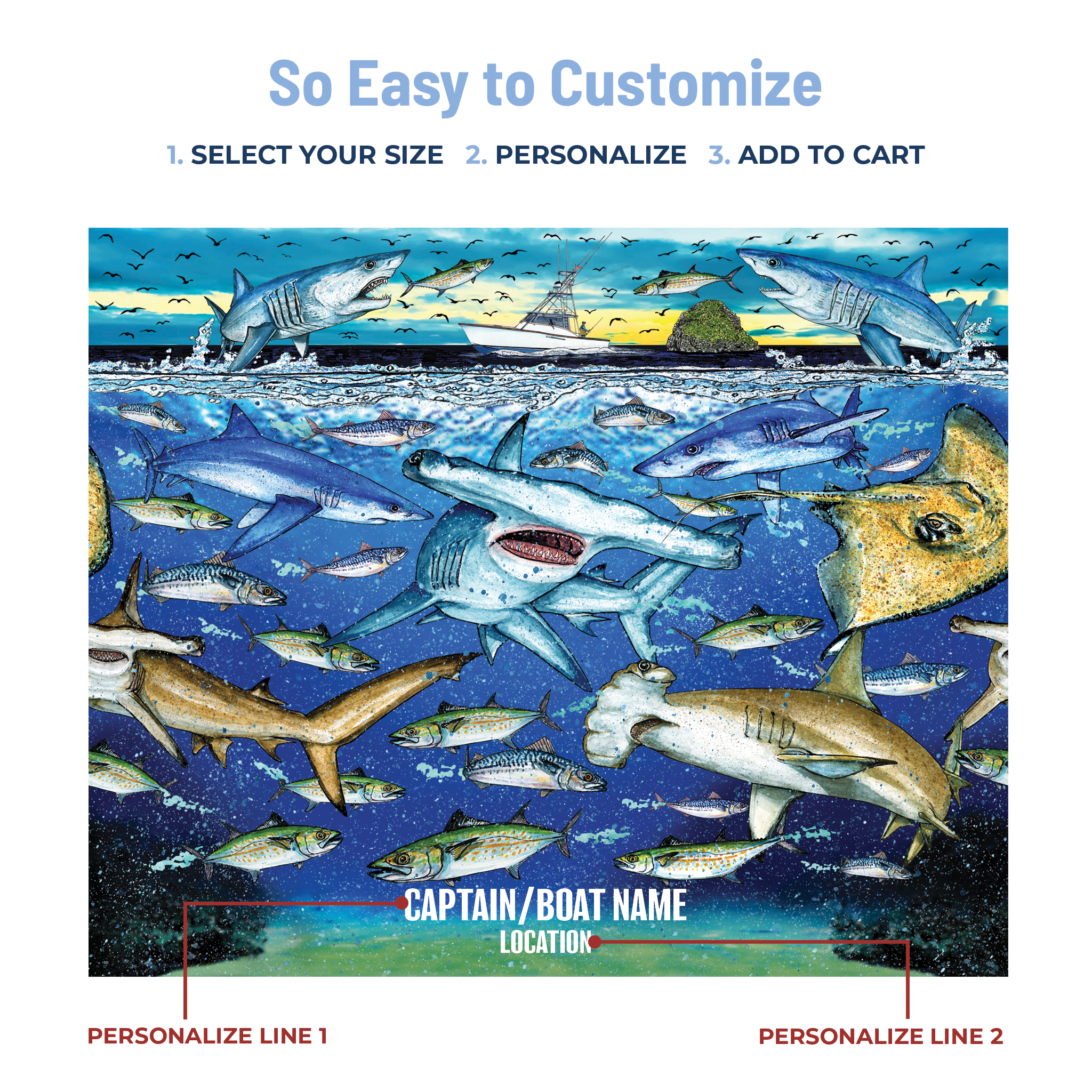 Did you know that some shark species can swim up to 20 miles per hour, making them formidable predators of the sea? Personalize it with two lines of text to celebrate your passion for shark fishing and the unforgettable moments spent on the water.